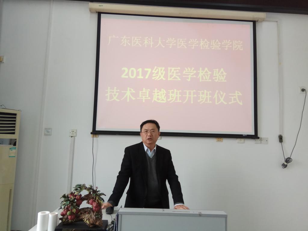 12月13日下午,医学检验学院2017级医学检验技术卓越班开班仪式在学院会议室举行,出席开班仪式的有学校副校长刘新光教授,医学检验学院院长徐军发教授,学院全体教师、广东医科大学衰老研究所的全体科研人员与在读博士生、生化教研室部分教师以及2017级卓越班的学生。会议由徐军发院长主持。