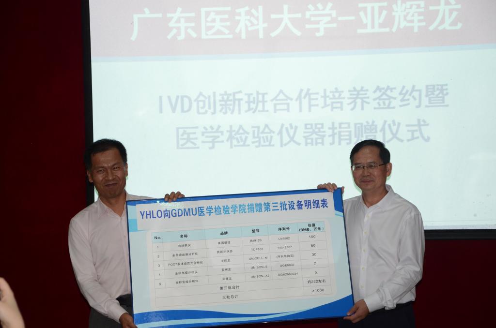 接着,亚辉龙公司首席科学家兼副总经理夏福臻代表公司向广东医科大学-亚辉龙医学检验创新人才培养实验平台(下称创新实验平台)捐赠价值250余万元的医学检验仪器设备,医学检验学院徐军发院长代表创新实验平台接受捐赠。