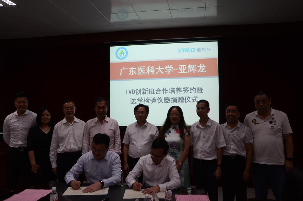 最后,在与会领导嘉宾的共同见证下,亚辉龙公司副董事长兼总经理宋永波先生和医学检验学院院长徐军发分别代表己方在广东医科大学-亚辉龙体外诊断产业技术创新班合作培养协议书上签字。至此,签约捐赠仪式画上圆满句号。