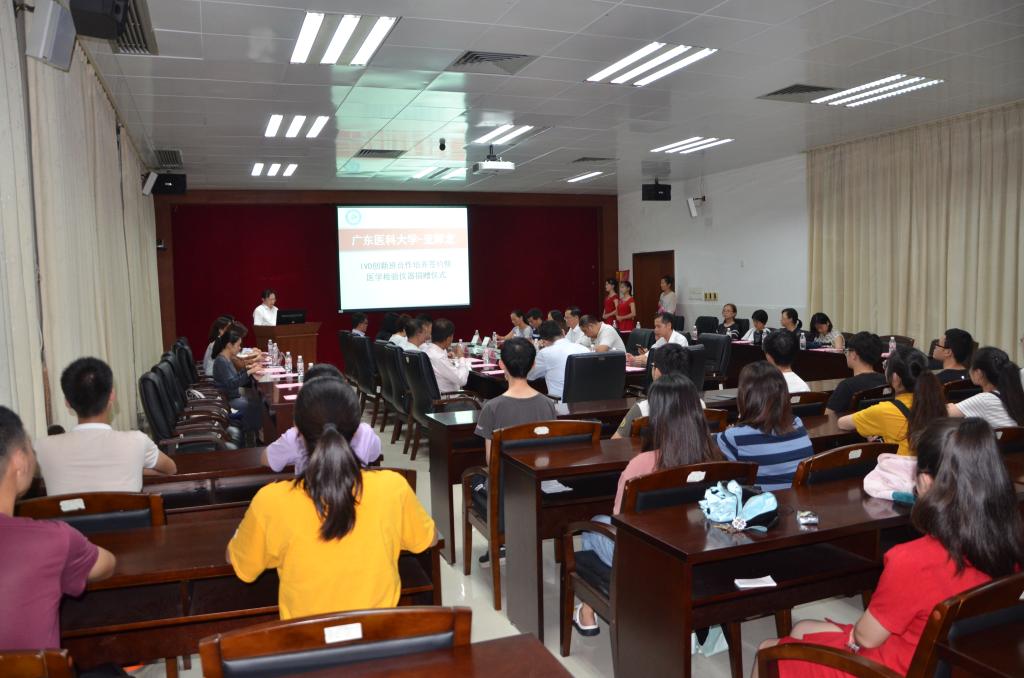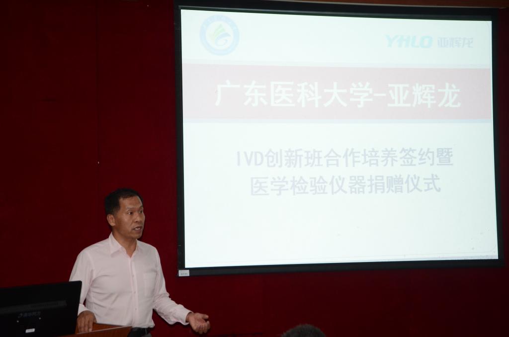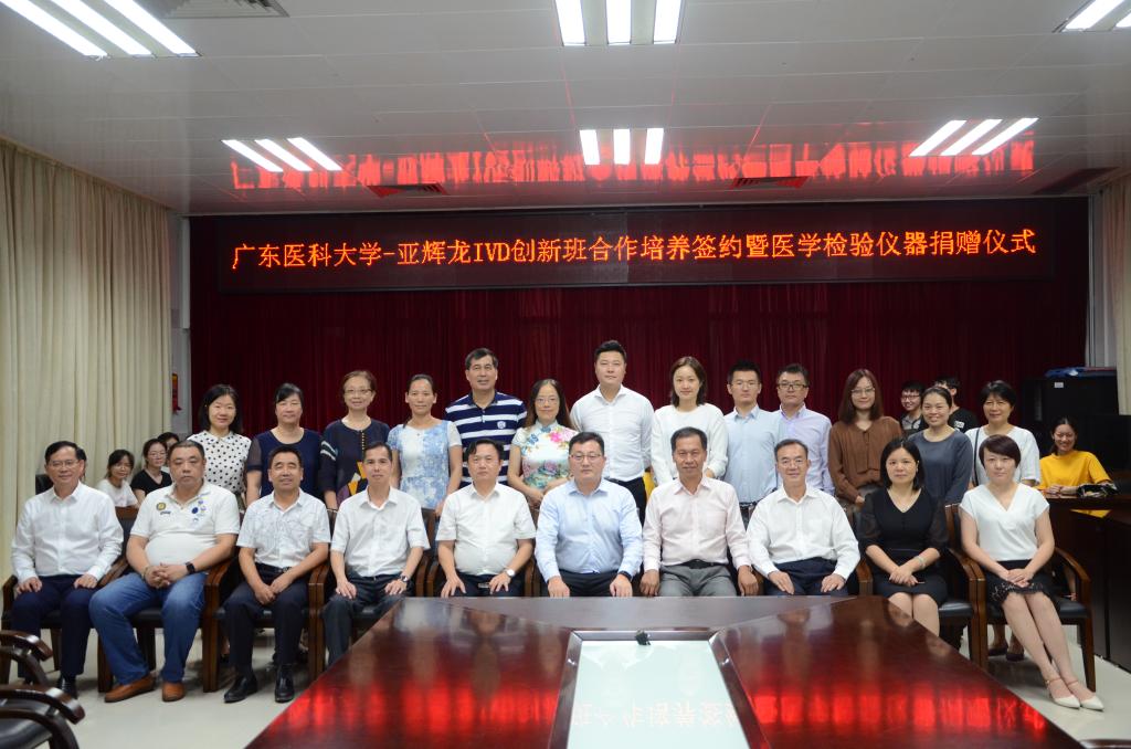7月4日晚,深圳市亚辉龙生物科技股份有限公司(下称“亚辉龙公司”)副董事长兼总经理宋永波先生、副总经理兼首席科学家夏福臻先生等一行十余人来校参加在东莞校区实验平台635室学术报告厅隆重举行的“广东医科大学-亚辉龙体外诊断产业技术创新班合作培养签约暨医学检验仪器捐赠仪式”(下称签约捐赠仪式)。广东医科大学参加会议的有学校副校长刘新光教授、校学工部谭秋浩部长、校教务处贾振斌副处长、校社会合作处陈军副处长、医学检验学院院长徐军发教授、党委宁静书记以及学院其他领导、各科室正副主任以及部分学生代表。