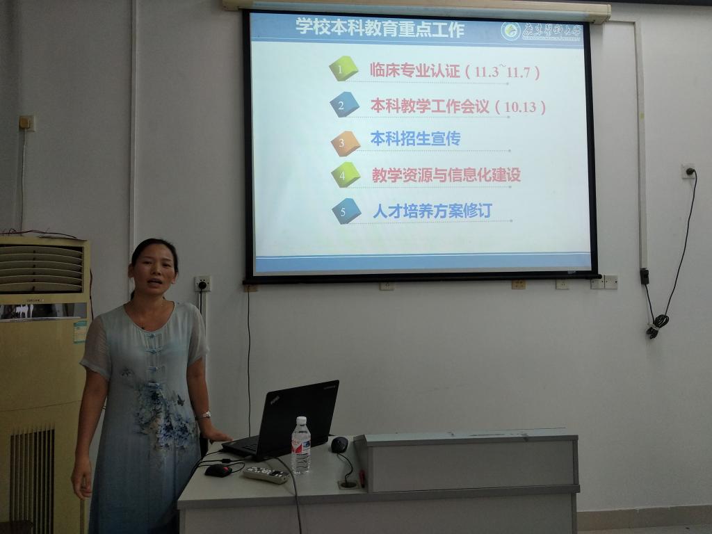 首先,阮杰副院长就本科教学工作作了教学专题工作报告。报告指出学院的各项工作均应当坚持以学生为中心并紧紧围绕此项中心工作,积极高效地做好以下五个方面的具体工作。一、积极推进“双万”计划建设,在申报国家和省级一流专业的基础上加强一流课程建设,将一流专业建设落到实处;二、精细化教学管理,力求做到规范教学,达到教与学的和谐相长;三、积极引进运用信息技术化教学,提高课堂授课功效;四、加大对虚拟实验项目的建设力度,保障本科教学质量的稳步提升;五、做好医学实验技术新专业课程教学大纲的编写工作,为新专业人才培养保驾护航。