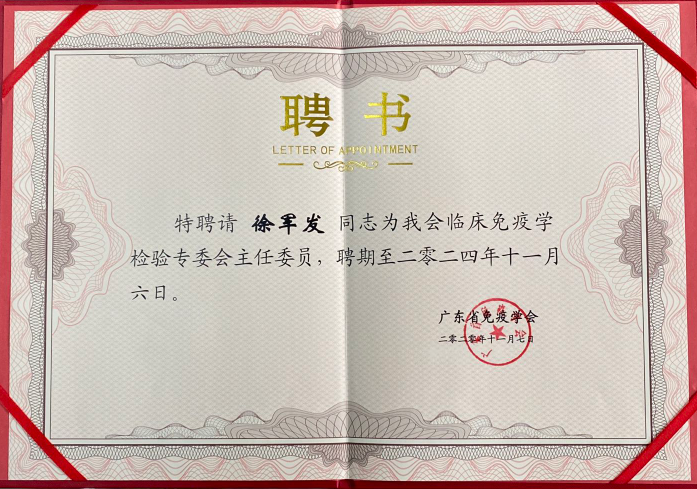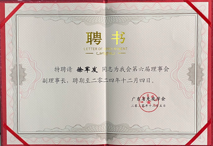 徐军发教授再次当选为广东省免疫学会副理事长兼临床免疫学检验专业委员会主任委员