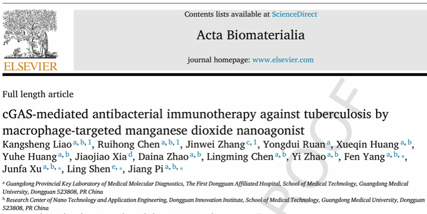 近日,我校免疫与感染性疾病研究团队在Acta Biomaterialia(中科院一区,IF=9.4)报道了靶向结核感染巨噬细胞cGAS介导自噬通路的抗结核新策略,开发了一种巨噬细胞靶向的二氧化锰纳米材料(Tuf-Rif@HA-MnO2 NPs),不仅可以实现抗结核药物的巨噬细胞靶向递送,且进入巨噬细胞后能与胞内谷胱甘肽(GSH)反应,直接在感染巨噬细胞内释放二价锰离子(Mn2+)以激活其cGAS通路、及其介导的自噬,从而进一步增强巨噬细胞、DCs、T细胞的抗结核免疫保护功能。结果显示Tuf-Rif@HA-MnO2 NPs能结合靶向药物递送和cGAS-自噬介导的抗结核免疫保护功能,以更有效、协同地抑制Mtb感染、减轻结核病损,该策略有望用于开发更有效的结核病或耐药结核病宿主导向治疗新方案。
