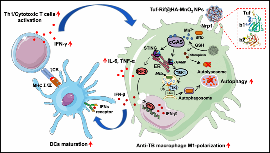 由结核分枝杆菌(Mtb)感染引起的结核病严重威胁着我国公共卫生安全。研究表明,巨噬细胞是宿主抵御Mtb感染最重要的免疫细胞之一,也是Mtb在体内的主要寄居地。Mtb通过破坏或抑制巨噬细胞的抗结核免疫保护功能以实现其免疫逃逸,从而在胞内存活、寄生,甚至进一步复制、扩大感染。近年来的研究发现,Mtb可能通过破坏或抑制巨噬细胞cGAS介导的抗菌免疫和自噬以实现免疫逃逸,国内同行和我们近期的研究均发现:通过二价锰离子(Mn2+)激活感染巨噬细胞中cGAS通路和自噬能有效抑制体外和体内Mtb感染。然而,二价锰离子(Mn2+)的性质极不稳定、易被氧化,且在体内易扩散、靶向性差,难以直接用于抗结核治疗。