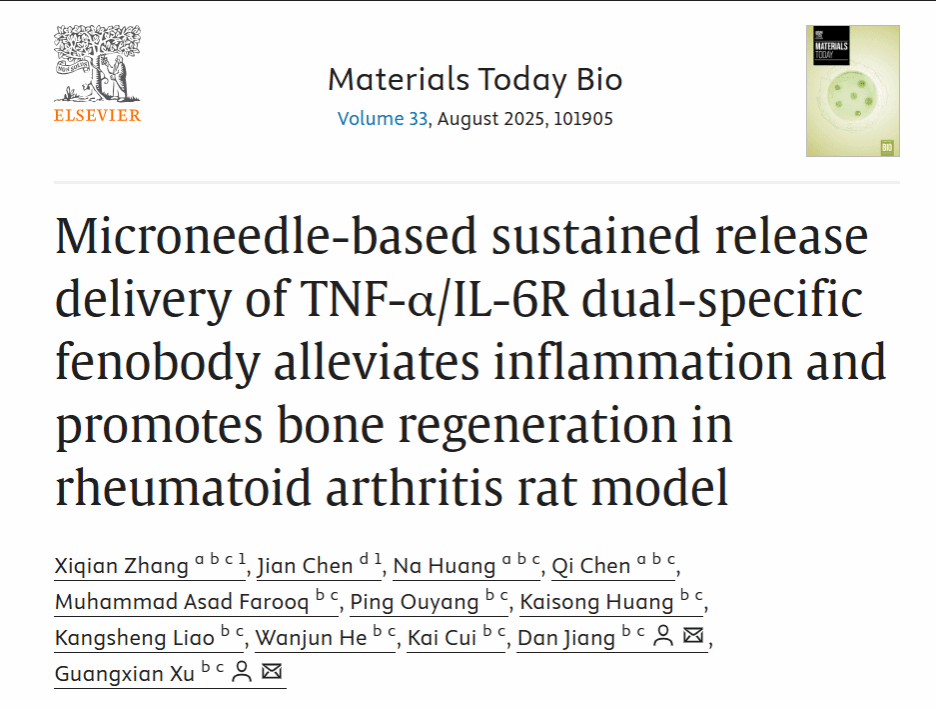 近期,广东医科大学徐广贤教授团队在国际学术期刊Materials Today Bio期刊(IF=10.2分,中国科学院top1区)上发表了题为《Microneedle-based sustained release delivery of TNF-α/IL-6R dual-specific fenobody alleviates inflammation and promotes bone regeneration in rheumatoid arthritis rat model》的论文。该论文第一作者为广东医科大学与宁夏大学联合培养的2021级博士研究生张西倩。论文通讯作者为广东省医学免疫与分子诊断重点实验室、伟德国际1946源于英国、广东医科大学附属东莞第一医院和东莞市分子免疫与细胞治疗实验室徐广贤教授和蒋丹博士。