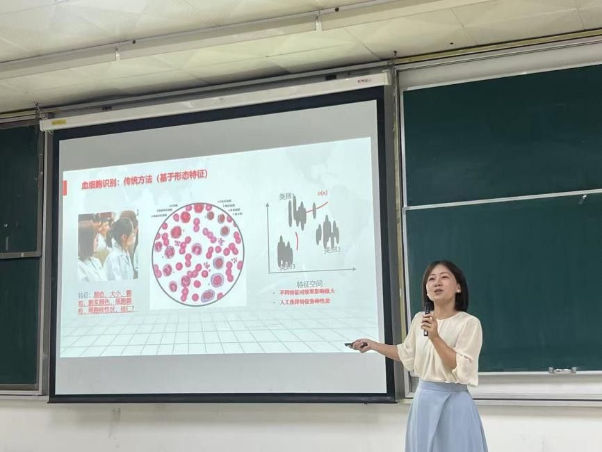 在论坛开始前,齐博士结合瑞图生物的研发实践,以《人工智能辅助外周血细胞形态学检查的应用研究》为题,为师生带来了一场深入浅出的专题教学。她系统介绍了“AI+形态学”解决方案的核心内容,包括:卷积神经网络(CNN)等智能算法的基本原理、训练范式与评估方法;“AI+血细胞”在临床检验中的具体应用场景、优势与挑战;以及实际落地中的质量控制与模型可解释性等关键问题。整场教学案例生动、演示丰富,有效激发了同学们对医工交叉领域的浓厚兴趣。