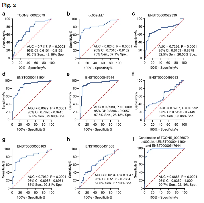 进一步的ROC曲线结果显示,筛选出的8个lncRNA对儿童B-ALL和T-ALL患者具有明显的区分效果,具有较好的敏感性和特异性。其中lncRNA TCONS_00026679、uc002ubt.1、ENST00000411904和ENST00000547644组合成为区分儿童B-ALL和T-ALL的最具潜力的新生物标志物,AUC值最高为0.9686,这意味着该特定的 lncRNA 组合具有诊断儿童 ALL亚型的潜力。