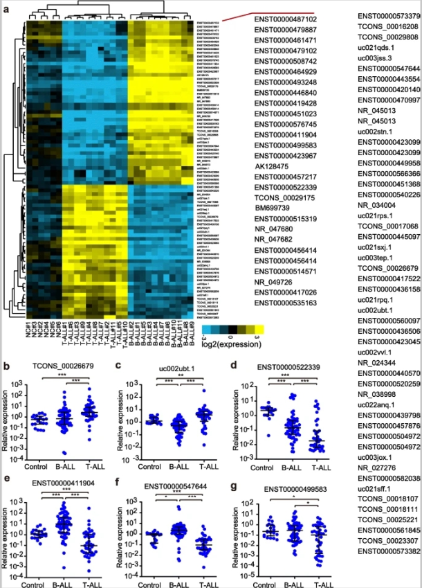 图1. LncRNA在儿童B-ALL和T-ALL患者中的表达