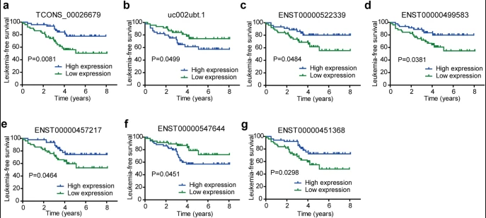 该研究还发现了高表达TCONS_00026679 (p=0.0081)、ENST00000522339 (p=0.0484)、ENST00000499583 (p=0.0381)、ENST00200704 (p=0.0081)和ENST00200704 (p=0.004)的患儿与低表达这些lncRNA的患儿相比,8年无白血病生存率显著增高;而高表达uc002ubt.1 (p=0.0499) 和 ENST00000547644 (p=0.0451) 的患儿与低表达这些lncRNA的患儿相比,8年无白血病生存期显著缩短,提示这些lncRNA具有作为预后标志物的潜能。